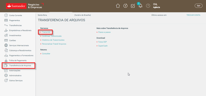 Ao acessar o Internet Banking do Santander, no menu lateral esquerdo, clique em Transferência de Arquivos → Transmitir.