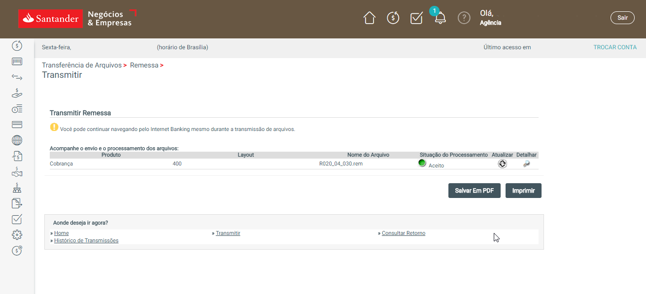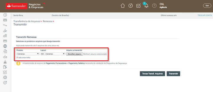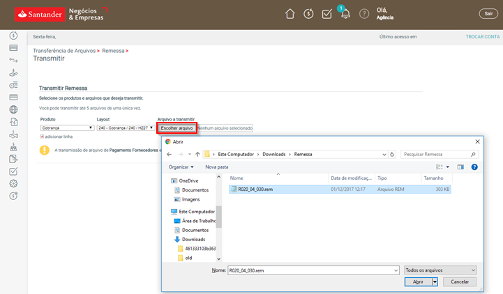 Seja na hora de homologar a sua carteira de recebimento ou quando você faz operações pelo Applet, pode ser necessário enviar o arquivo remessa ao seu banco pelo Internet Banking. Veja abaixo como fazer isso se você for cliente do Santander.