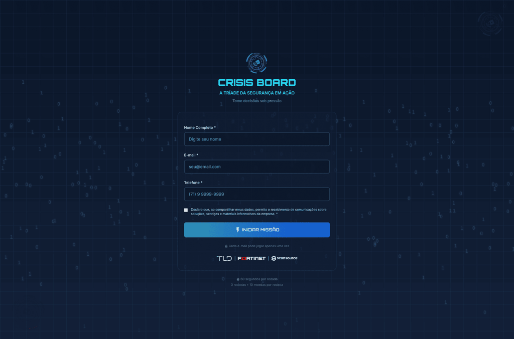 CRISIS BOARD – A TRÍADE DA SEGURANÇA EM AÇÃO é um game desenvolvido para simular tomada de decisões em cenários críticos. A dinâmica desafia os participantes a gerenciar recursos limitados durante um ataque ransomware, equilibrando três pilares estratégicos.